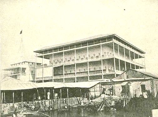 Sedli smo v čolniče in se peljali do obrežja, kjer smo izstopili na kopno in šli po širokih stopnicah. Pred sabo smo uzrli starinsko portugalsko poslopje »Boma«, kjer je sedaj okrajni urad. Staro je to zidovje, vendar vsekako še dosti trdno; pred njim je črno-rudeča vojaška stražnica, in ne malo ponosno korači kraj nje vojak - zamorec. Črnci so kaj žilavi vojaki, in si mnogo domišljujejo o vojaški časti in službi.