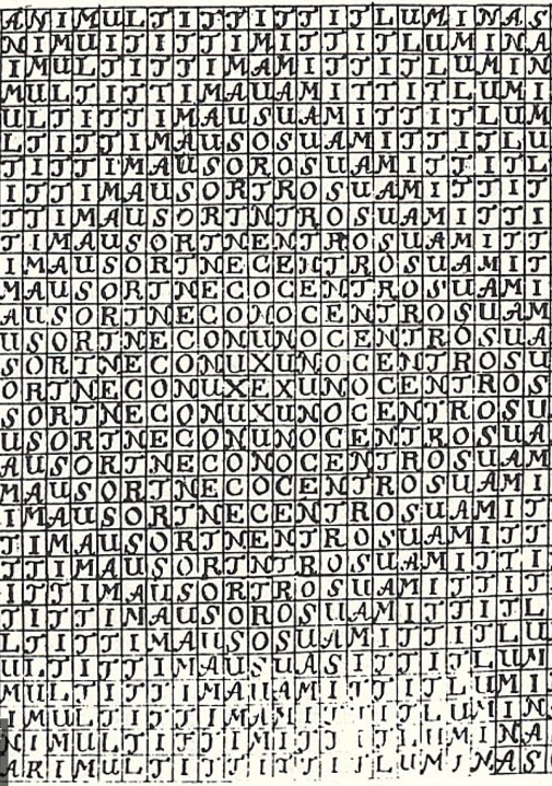 Johann Knorr von Rosenroth Kabbalae Denudatae ... Liber Sohar (2. v., Frankfrut, D. Zunner, typis B. C. Wustii (1684), po Piotr Rypson: The Labyrinth Poem, Akademia Ruchu Theater Publications, Varšava, Poljska.