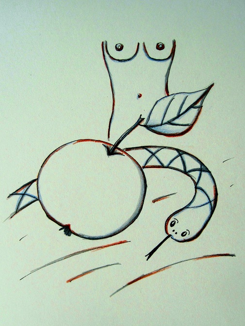Drei göttliche Fehlentscheidungen: Eva, der Apfel und die Schlange.