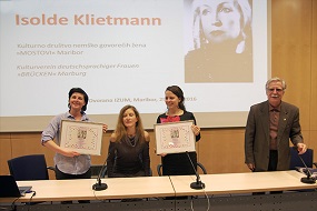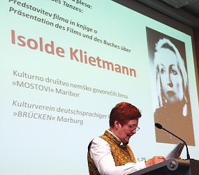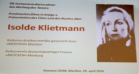29. april 2016 - Predstavitev filma in knjige o Isolde Klietmann - V dvorani IZUM na Prešernovi 16 je bila ob 11. uri v organizaciji Društva nemško govorečih žena Mostovi Maribor / Kulturverein deutschprachiger Frauen Brücken Marburg predstavitev filma in knjige o Isoldi Klietman. Publikacijo z naslovom Maribor se spominja Isolde Klietmann je uredila Tinka Legvart in je zanjo napisala tudi uvodno besedilo, o znameniti plesalki pa so pisale Barbara Windtner, Ulrike Hager, Daliborka Podboj in Minka Veselič Kološa. Avtorica filma o Isolde Klietmann je Barbara Windtner po ideji Ulrike Hager. Publiki je projekt širše predstavila predsednica društva Veronika Haring, prisotne je pozdravil direktor Javnega sklada RS za kulturne dejavnosti mag. Igor Teršar, ki je dogodek postavil v kontekst Svetovnega dneva plesa, s katerim je dogodek sovpadal, o knjigi je govorila Tinka Legvart in o filmu Barbara Windtner. Ob tej priložnosti sta Barbara Windtner in Ulrike Hager prejeli priznanje Zveze kulturnih društev Maribor, ki jim ju ga je podelil njen predsednik mag. Franci Pivec.